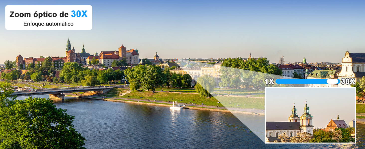 Esta cámara ofrece imágenes de alta resolución con 5 millones de píxeles (2560 x 1920P) y admite zoom óptico de 30x y zoom automático, para que pueda ampliar libremente sin preocuparse de que la imagen salga borrosa.